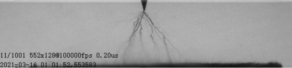 西安交通大学采用千眼狼X系超高速摄像机,以10万帧帧率清晰观测到绝缘油中的高压放电过程中的放电流柱生长过程,为绝缘油的改性提供实验依据。
