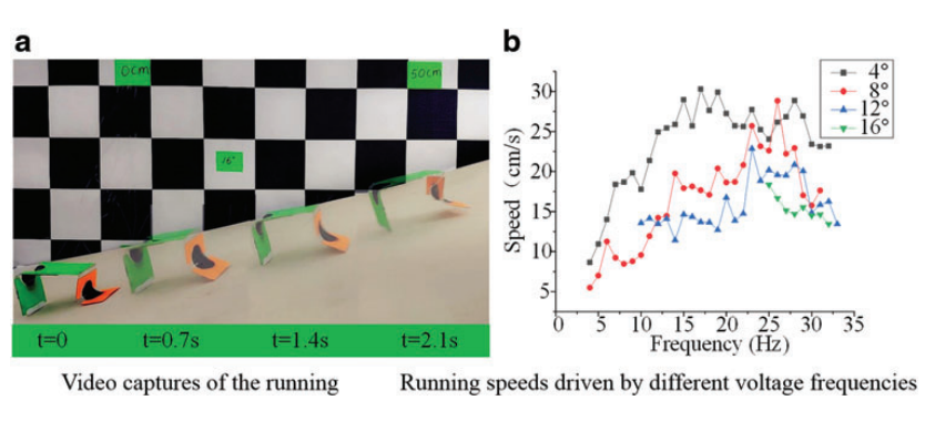 (a)奔跑时拍摄的视频;(b)不同电压频率驱动的运行速度。