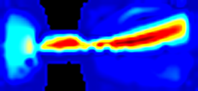 计算结果:RFlow软件在微通道靠近壁面处呈现梯度流,并在通道出口处形成一束向上壁面弯曲的射流,并在接触到壁面后形成回流区。